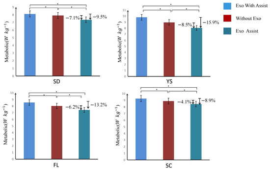 The choice of assisted time and the magnitude of the assistant force were critical for reducing the metabolic cost of the exosuit [36].The metabolic consumption of all subjects is shown in the Figure 6. Four subjects performed metabolic tests under three conditions: wearing the exosuit without assistance, not wearing the exosuit and wearing the exosuit with assistance. The results showed that, under the condition of wearing the exosuit with assistance, the metabolism of the four subjects on the stairs was reduced, and the metabolic reduction of YS was the largest, reaching 15.9%. The average reductions in the condition of NO Exo and With Ass were 6.9% and 11.8% compared to wearing an exosuit without assistance.