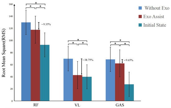 The degree of muscle fatigue was obtained using sEMG. Muscle RF, VL and GAS represent the rectus femoris, vastus lateralis and gastrocnemius muscles, respectively. Without Exo and Exo Assist denote the states without exosuit and with exosuit with assistance, respectively. Initial state represents the initial muscle fatigue level before the test. * denotes statistical significance (p < 0.05) between two bars.
