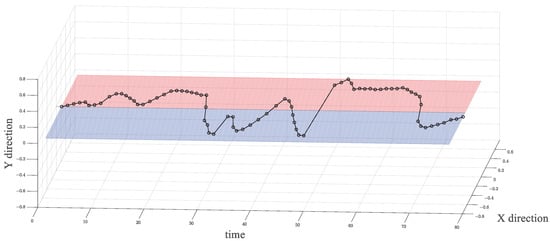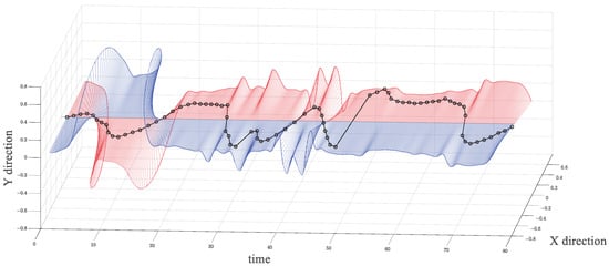 Figure 1 shows an example of two-dimensional series. Figure 2 illustrates the curve surface made of base angle series and the red part is the positive direction while the blue part is the negative direction. In fact, only those base angle series corresponding to the points on the black line were meaningful. For a better display, the angle series between the real base angle series was obtained via spline interpolation. Figure 3 illustrates the “flattened” surface and the signal. At time period of 7 to 15 s (the time difference for each point on the black line is one second), although the “trend” of the curve was “downward” according to Figure 1, the change rate of phase of those points was not steep so that those points remained in positive direction in Figure 3.