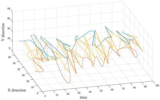 Figure 7 demonstrates the decomposition results of the indoor trajectory. Blue lines illustrate the original series in time-x-y coordinates, orange lines illustrate the IMFs and residual. The left column is the axonometric projection graph of the original series, the IMF series and the residual series. Each sub-figure in the right column is the vertical view of the original series, the IMF series or the residual series.