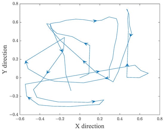 A walking trajectory was used to test the complex empirical mode decomposition. The data were collected in an about 25 m2 room and the direction of the trajectory changed frequently. In the experiment, the tester held a device combination with mounted camera and single board computer and walked freely in the room. In the meantime, the trajectory of the tester was computed via ORB-SLAM. Each point of the trajectory includes the timestamps, x coordinate and y coordinate. The original signal was formed by linking the points of the trajectory in time order and was shown in Figure 6.