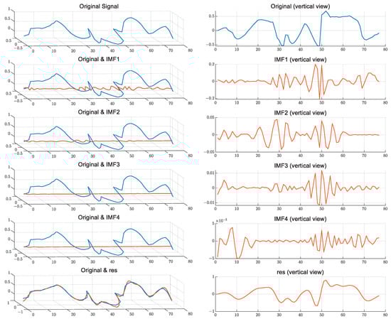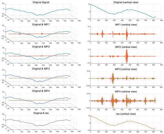 Figure 9 demonstrates the decomposition results of the outdoor trajectory. The blue lines illustrate the original series and the orange lines illustrate the IMFs and the residual. The left column is the axonometric projection graph and the right column is the vertical view. In the left column, the amplitudes of the IMFs in the left column of the figure were 15 times larger than the actual values because the actual amplitudes were too small compared to the original series and the residual, making them not clearly visible in the figure.