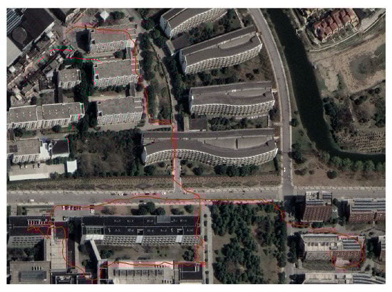 Another walking trajectory of a participant was used to test the performance of the CEMD. In the experiment, the tester walked in the campus of Tongji University and held a mobile GPS receive device to collect the GPS log data. The latitude, the longitude and the timestamps of the GPS logs were used and linked in time order to form the original signal. The GPS devices recorded 827 points in 15 min and 36 s and the trajectory is 1.3 km long. In the recorded trajectory (Figure 8), there were longer straight sections, some turns and occasional back-and-forth movements at certain locations.