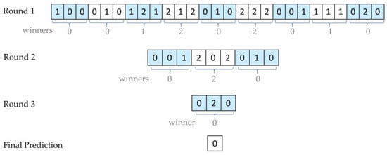 An example of tournament voting is illustrated in Figure 2. In this example, the predicted values coming from the classifiers are gradually evaluated in groups of three. There are three class labels: “0”, “1”, and “2”. The dominant class label in each group is determined as the winner. For example, the winner of the first group [1 0 0] in the first round is determined as label “0” and fed to the next round to compete again with the results of other groups. In the figure, the winners of groups are shown below the round. In the first round, there are 9 groups, and the winners of these groups are [0 0 1 2 0 2 0 1 0], respectively. These winners compete once again in the second round. The winner of a group is the class label that achieves the highest number of votes from each classifier in the group. Therefore, the winners of the groups in the second round are “0”, “2”, and “0”, respectively. This voting continues until a single result is achieved. In the last round, the class label “0” is handled as the final prediction.