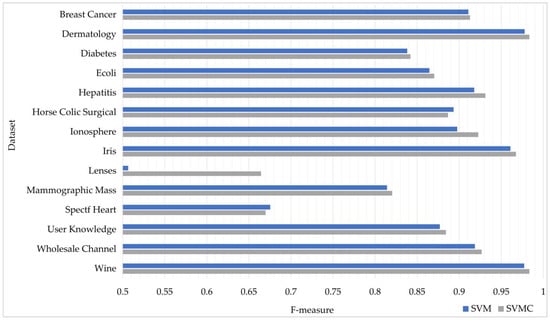 As some of the datasets were imbalanced according to the target classes, the F-measure values were also assessed. The F-measure values obtained by the SVM and SVMC methods are visually represented in Figure 3. As can be seen, SVMC outperformed SVM in terms of the F-measure in 12 of 14 datasets. For example, SVMC (0.9663) achieved better performance than SVM (0.8976) on the ionosphere dataset. SVMC increased the performance of the model since it applied a special feature selection and sampling strategy to build a chain structure. Another reason is that the final result was reached by tournament voting, rather than majority voting.