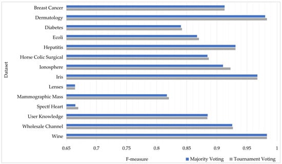 The F-measure values obtained by the majority voting and tournament voting techniques are visually displayed in Figure 4. For example, TV (0.9663) demonstrated better performance than MV (0.9103) on the ionosphere dataset. As can be observed, TV usually achieved higher F-measure values than MV. This is because grouping the results and analyzing them locally decreases the disadvantage that can occur in the event of equal votes, as opposed to returning the value that is most prevalent among all outcomes as the final result.