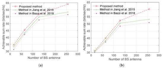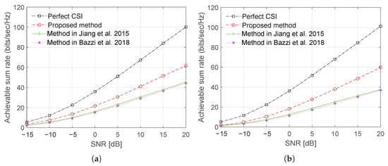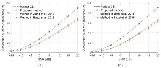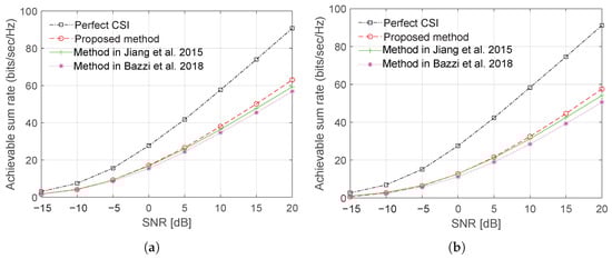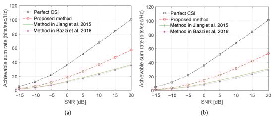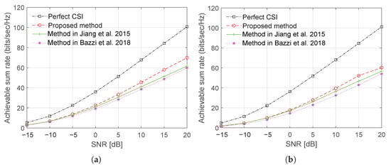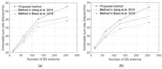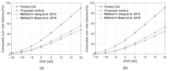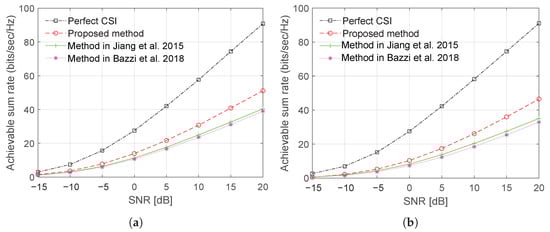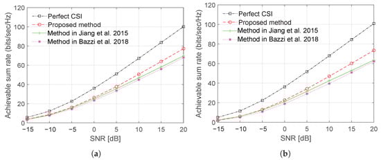 Figure 10 and Figure 11 show, respectively, plots of the sum rate using Laplacian and OR channel models as a function of a number of BS antenna with CCT and SNR = 15 dB. The results demonstrate a significant improvement in the sum rate performance can be achieved with the proposed training sequence design.
