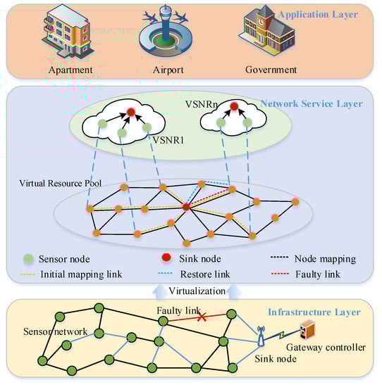 Each VSNR constitutes virtual sensor nodes that need to be mapped to the physical sensor nodes of the underlying WSN in order to provide services to users, and the same is true for links. However, current IoT mapping algorithms mostly assume the absence of physical failures [], and they optimize the network model to improve resource utilization and increase revenue, but ignore the issue of link failures caused by the wireless communication characteristics of WSNs. Network virtualization enables the reuse and sharing of physical resources;however, it also introduces the problem of many virtual links failing due to the failure of a physical link, leading to the failure of multiple VSNs. When VSN requests arrive, the WSNInP needs to undertake the offset in the Service Level Agreement (SLA), which may cause significant economic and reputational losses to the WSNInP that leases the affected physical link. Therefore, while efficiently and reasonably mapping VSN, it is necessary to provide fault tolerance mechanisms for the tasks carried by VSNs, to ensure quick recovery to normal operation in case of network failures, maintain continuity of network services, and ensure the survivability of the VSN.