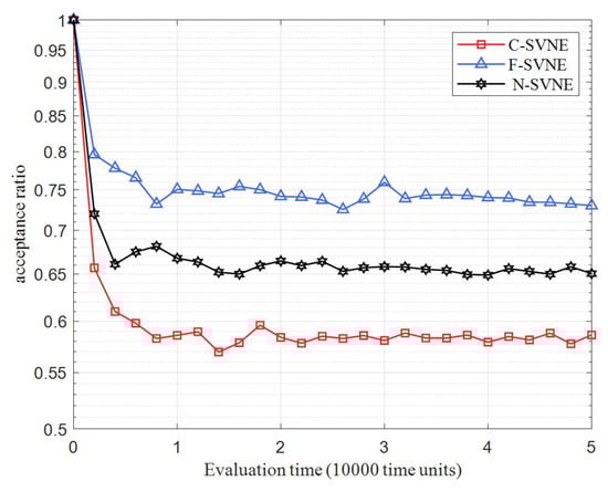 In Figure 2 and Table 5, the trend of the VSNR acceptance rate over time for three comparison algorithms is shown. It can be seen that the acceptance rate of VSNR in the comparison algorithms begins to drop from 1 over time and eventually tends to become stable in dynamic equilibrium. In the initial stage of virtual network mapping, the nodes and links in the underlying physical WSN have rich resources, so the initial three algorithms have a high acceptance rate. As the underlying physical network resources occupied by previous VSNR requests increase, physical WSN resources are reduced, resulting in some VSNRs being rejected due to insufficient resources. The VSNRF-SVNE algorithm proposed in this paper finally accepts a rate that is steady at around 0.73, which is higher than that of other algorithms. This is because, during the node mapping stage, the F-SVNE algorithm, using the measurement of activity index, leads the task of physical nodes bearing selection to be relatively balanced, and the contrast algorithm is preferred in current physical network resources of nodes and links. As a result, a large number of key nodes and links are rapidly occupied, and subsequent VSN mapping fails.