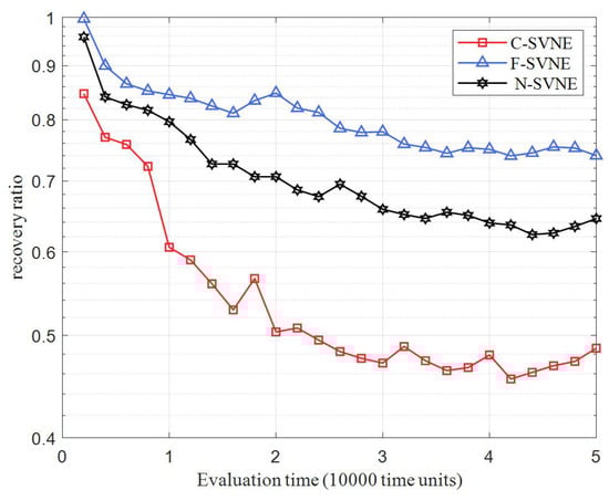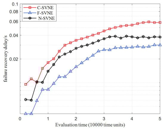 In Figure 3 and Table 6, the average failure recovery rate for three comparison algorithms is shown. It can be seen that the average failure recovery rate of the comparison algorithms gradually decreases and tends to become stable with time. In the initial phase of virtual mapping the resources in the physical network are sufficient to recover faulty links. As the number of VSNRs increases, a large amount of underlying physical resources become occupied and the resources used for fault recovery decrease. As a result, the average fault recovery rate decreases. Among them, the F-SVNE average recovery rate is the highest. This is because the algorithm uses multiple path selection algorithms for backup routing collection, a collection of backup paths meets the resource constraints, and the priority use of link resources balances the large backup paths. Fragmentation occurs when reducing resources, the remaining backup resources are optimized at the same time, and the average recovery rate increases. The reason that C-SVNE has the lowest average failure recovery rate is that when a link failure occurs, it adopts the shortest path algorithm to recover the link failure. As the remaining available resources of the underlying physical network gradually decrease, it cannot discover the appropriate communication route for remapping the faulty link.