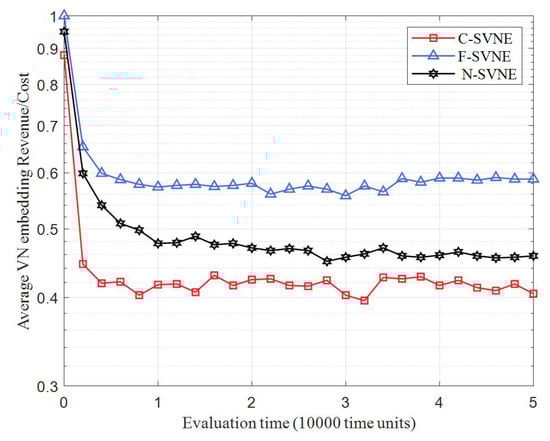 In Figure 5 and Table 8, the long-term average revenue-cost ratio for three comparison algorithms is shown. From the diagram, we can observe that the long-term average cost of the three algorithms gradually decreases over time and reaches a stable state. This is because as a large number of physical network resources are being used, some physical link failures cannot be restored due to insufficient resources, resulting in lower average income than cost for a prolonged period, and a dynamic balance in a steady state is eventually achieved. The long-term average revenue-cost ratio of the F-SVNE algorithm is consistently higher than that of the other two algorithms, and finally stabilizes at around 0.6. This is because, on one hand, the F-SVNE algorithm reduces the fragmentation of physical resources, optimizes the remaining backup resources, and improves the acceptance rate of VSNRs, thereby increasing the revenue. On the other hand, when a physical link fails, the F-SVNE algorithm prioritizes the remapping of virtual links with high penalties based on link resource balance, reducing the penalties caused by failure recovery and improving the long-term average revenue–cost ratio.