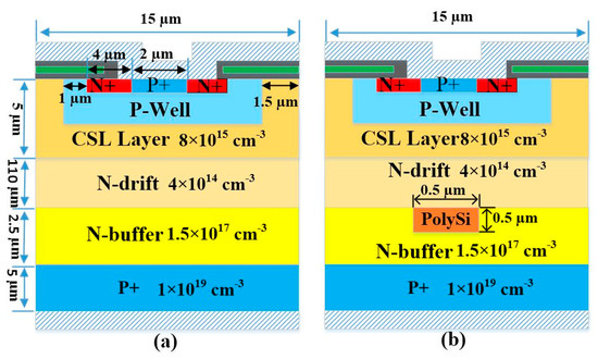 In recent years, with the development of science and technology, people are paying more attention to environmental issues. The concepts of green energy and carbon neutrality not only promote the development of power electronic technology, but also improve the performance requirements of power electronic devices [1]. However, silicon has approached its theoretical limits. Therefore, third–generation semiconductor materials represented by SiC and GaN are being considered to meet the demands of future high–voltage and high–power devices, and are expected to replace silicon (Si) devices in the high–voltage field, such as photovoltaic (PV) power generation, multi–electric aircraft, electric transmission, and hybrid electric vehicles [2]. GaN materials are mainly used in low–voltage and high–frequency–power devices such as radio frequency devices. Thus, SiC materials have more extensive applications in the high–voltage field. SiC materials have been used in the design of various power devices such as IGBTs (insulated gate bipolar transistors, IGBTs), MOSFETs (metal–oxide–semiconductor field–effect transistors, MOSFETs), BJTs (bipolar junction transistors, BJTs), and JBSs (junction barrier Schottky diodes, JBSs), due to their excellent physical properties including a wider bandgap, higher electron saturation rate, higher critical breakdown electric field and better thermal conductivity [3,4,5,6]. However, there are still many problems to be explored and solved. For example, some SiC devices are affected by barrier height inhomogeneities and low mobility caused by interface states [7,8]. On the one hand, some researchers propose to improve the performance of SiC devices by improving SiC materials [9]. On the other hand, some researchers propose to improve device parameters to obtain a better performance. Among the various power devices, SiC IGBTs are valued for their excellent trade–off performance between the I–V characteristic, blocking characteristic and dynamic characteristic. SiC IGBTs benefit from the advantages of MOSFETs and BJTs to achieve a strong blocking ability and low on–resistance (Ron). Thus, SiC IGBTs are suitable for application in smart grids and green energy generation for high–voltage application requirements [10,11,12,13,14,15,16].