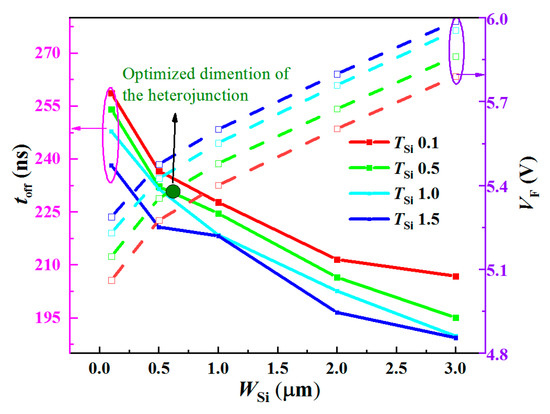 The trade–off curve of the optimization of WSi and TSi between toff and the VF of a 10 A current can be seen in Figure 3. The higher VF corresponded to a worse conduction loss. From Figure 3, with increasing WSi, the VF monotonically increased, but the toff decreased. Meanwhile, the higher TSi also caused a worse VF and a better toff when the WSi was constant. It is obvious that the device performance was influenced by the polySi material parameters, because the energy bandgap of silicon is 1.12 eV, which is about one third of that of silicon carbide (3.24 eV). Thus, holes from the P+ collector and electrons from the N–drift layer can easily flood into polySi, which increases the resistance and weakens the conductivity modulation. As a result, the forward characteristic degenerates for a wider WSi and thicker TSi. At the same time, a wider WSi and thicker TSi could store more carriers when turning off, and the narrower bandgap allows excess carriers to recombine more easily compared with silicon carbide, which can restrain the current tail and provide a better toff and Eoff. Therefore, increasing TSi and WSi leads to a better turn–off characteristic. It is more beneficial to optimize polySi, which can restrain the current tail and provide a better toff and Eoff. The optimization dimensions adopted for WSi and TSi were 0.5 μm and 0.5 μm, which are appropriate sizes for etching and photolithography selection. Meanwhile, better trade–off results between the toff and VF also can be achieved, as shown in Figure 3.