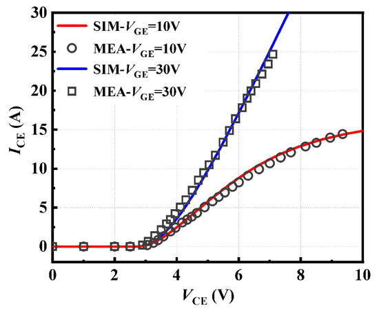 The I–V, blocking, and turn–off characteristics of the two structures were simulated using the Synopsys Sentaurus Technology Aided Design (TCAD) software. The key physical models for SiC power devices were adopted [26], including the Shockley–Read–Hall (SRH) model, Auger recombination model (AUGER), carrier speed saturation model (high–field saturation), incomplete ionization model, and mobility model (Lombardi). To validate the accuracy of the models used in the simulation, a structure consistent with the parameters in [27] was established, which indicated a good fitting result of the I–V curves, as shown in Figure 4.