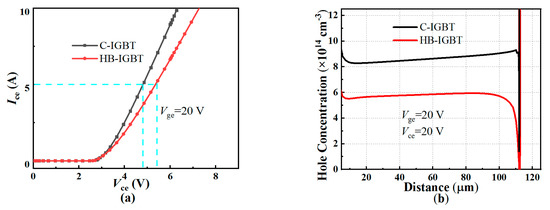 Figure 5a illustrates the forward I–V characteristics of the C–IGBT and HBL–IGBT. It was found that the VF of C–IGBT was 4.81 V, and that of the HBL–IGBT was 5.35 V, where the HBL–IGBT exhibited a slightly higher VF. The reason is that the polySi region stores a part of the holes from the P+ collector, which reduces the hole concentration of the drift layer, as shown in Figure 5b. It can be seen that the hole concentration of the HBL–IGBT in the drift region was lower than that of the C–IGBT, resulting in degradation of the conductivity modulation.