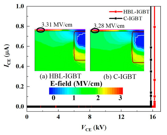 Figure 6 presents the blocking characteristic of the C–IGBT and HBL–IGBT. The breakdown voltage of both structures approached 16 kV because of the identical parameters of the N–drift and CSL layers. Furthermore, the insert figure shows the electric field distribution of the two structures at the breakdown voltage, which shows a similar electric field distribution. The maximum electric fields in the gate oxide of the HBL–IGBT and C–IGBT were 3.31 MV/cm and 3.28 MV/cm, which are acceptable for long–term gate oxide reliability [28].