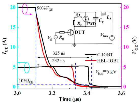 The turn–off performance of the two structures was investigated with a double–pulsed circuit, as shown in the insert of Figure 7. The bus voltage was 5 kV. The gate resistor was 10 Ω, and the gate voltage switched from 20 to 0 V. The load inductance, stray inductance, and parasitic capacitance were 3 mH, 20 nH, and 30 pF, respectively.