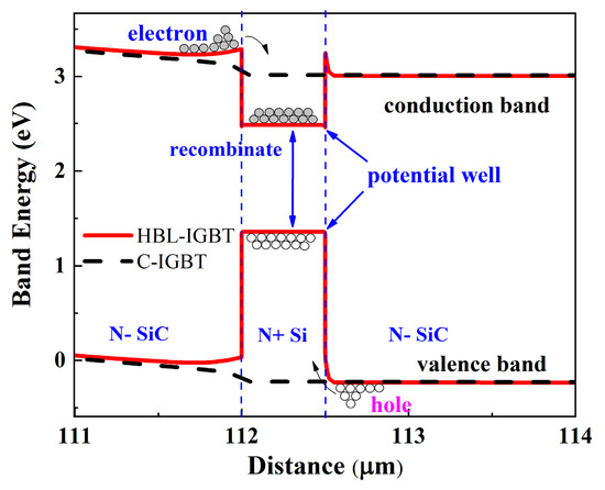 It can be seen that the toff of the HBL–IGBT and C–IGBT was 232 ns and 325 ns, respectively. This indicates an improvement of 28.6% in the toff. The Eoff was reduced from 2.619 mJ for the C–IGBT to 1.375 mJ for the HBL–IGBT, with a reduction of about 47.5%. The main reason is that the excess carriers can flood into the polySi region due to a natural potential well in the SiC/Si heterojunction, as shown in Figure 8, resulting in an increasing carrier concentration in the polySi region. A high carrier concentration and a narrow bandgap allow electrons and holes to combine more easily, resulting in a lower toff and Eoff.