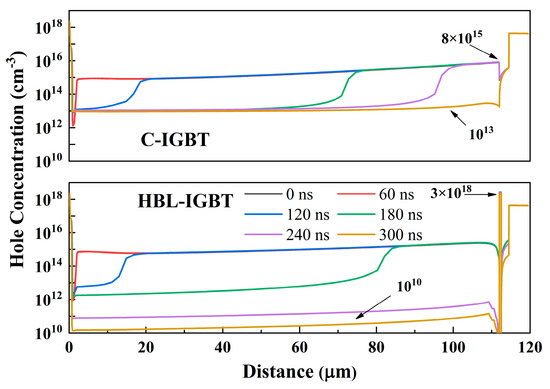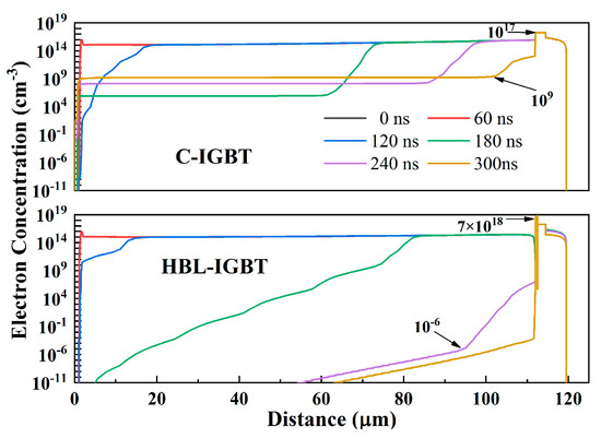 Figure 9 shows the distribution of the electron concentration of the C–IGBT and HBL–IGBT at the cutline along with the center of the device cell during the turn–off process every 60 ns steps. It can be seen that the electron concentration of the HBL–IGBT in the drift layer nearly reduced to 1 × 10−6 cm−3 at 240 ns, while the electron concentration of the C–IGBT stored in the drift layer remained at about 1 × 109 cm−3 at 300 ns. Furthermore, the maximum electron concentration was about 7 × 1018 cm−3 for the HBL–IGBT and 1 × 1017 cm−3 for the C–IGBT at 300 ns. This indicates that the huge electrons of the C–IGBT are kept in the drift layer and buffer layer, while the electrons flood into the polySi region in the HBL–IGBT during the turn–off process.