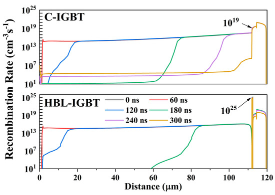 where n is the electron concentration, p is the hole concentration, and is the intrinsic carrier concentration, which is related to the bandgap and temperature. Additionally, is constant when the bandgap and temperature do not change. It is easy to see that the electrons and holes flood into the heterojunction, which increases the carrier concentration in the polySi region. Therefore, the partial of the equation increases, resulting in improvements in both SRH recombination and Auger recombination. Moreover, the bandgap of polySi is less than that of SiC, which means decreases. represents the difference between the recombination center and conduction band or valence band. Therefore, the highest recombination rate of the HBL–IGBT was more than 1025 cm−3·s−1. At the same time, the highest recombination rate of the C–IGBT was about 1019 cm−3·s−1 at the same position. It can be seen that the recombination was enhanced by the heterojunction structure during the turn–off process.