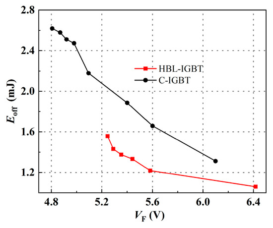 VF can be reduced and increased by changing the carrier lifetime. A higher carrier lifetime means that more holes can be injected into the N–buffer from the P+ collector, resulting in a better hole injection efficiency and leading to improvements in the conductivity modulation, obtaining a lower VF. However, higher amounts of excess carriers require more energy and time to sweep off, resulting in a higher Eoff. The trade–off relationship between the Eoff and VF is shown in Figure 12. It is shown that the HBL–IGBT presents an improved trade–off between the Eoff and VF compared with the C–IGBT, indicating a better dynamic performance.
