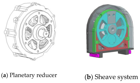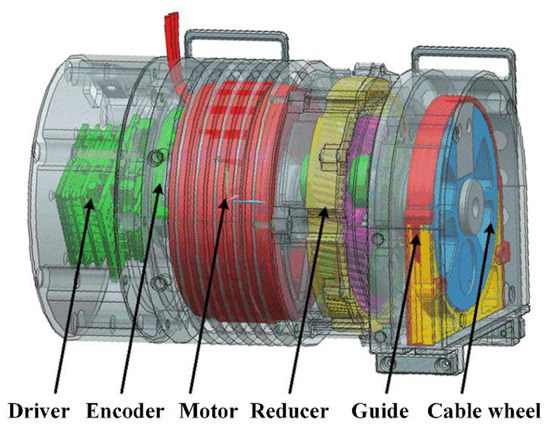 To meet the requirements of light weight, low power consumption and high performance of the flexible system, the motor and the Bowden cable fitted to the human leg are used as an active driving unit to enhance the movement ability of the corresponding muscles. The total weight of the cable-driven module is less than 1 kg. The cable diameter is 1.6 cm, which can withstand the maximum tension of about 1800 N. Through reasonable setting of the force transmission path and accurate control of retraction and release, it simulates the force generation process of human muscle to assist the plantar-flexion movement of the ankle joint. The design of the driving unit mainly focuses on the integration of the driving device, transmission device and executive device.
