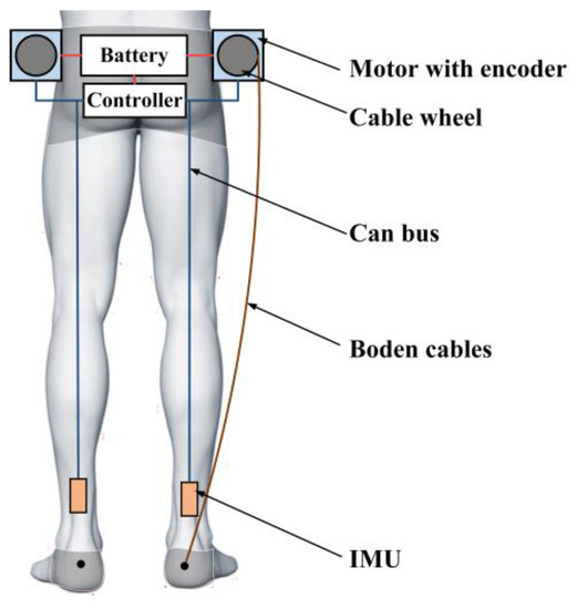 As shown in Figure 4, the sensor composition of the lower extremity exosuit is relatively simple, including only inertial measurement units (IMUs) and encoders (Renishaw, MB039 + MRA039). The IMUs are installed on the calf straps by suturing, and are mainly used to measure the change data of the calf swing angle in the gait cycle, which provides a basis for the subsequent gait phase division. The encoders are integrated in the driving units to measure the rotation angle of the motors (Kormorgen, TBM7615), so that the length of the Bowden cable can be calculated to provide data feedback for the position closed-loop control.