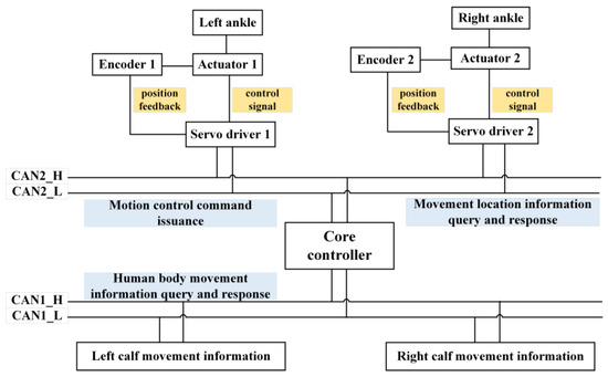 The system contains a two-channel CAN bus, which is used for communication between the core controller (STM32), multi-sensor group, and servo driver (Elmo, Gold Twitter). It is mainly responsible for collecting sensor information and human body motion data, completing the delivery of servo control instructions, and feeding back the location of the actuators, etc. The system information flow chart is shown in Figure 5.