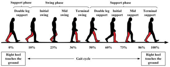 The time between any two identical motion states in the gait process is defined as the gait cycle, which is usually regarded as the process between two adjacent heel touches, as shown in Figure 6.