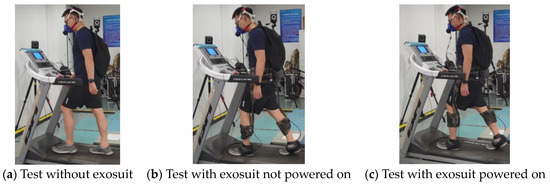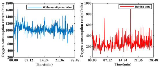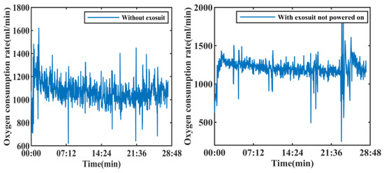 Oxygen consumption rate is a quantitative indicator that characterizes the metabolic level of human exercise. If under the same motion conditions this physiological data of the human body is significantly reduced after wearing the wearable robot, it can indicate that this equipment can save a part of physical energy consumption. In order to prove the effectiveness of the system proposed in this study, we have used a portable respiratory metabolism monitoring system (K5) to monitor the oxygen consumption data of motion under three conditions: without the exosuit, with the exosuit powered off and with the exosuit powered on. In each test condition, the wearer is required to carry a 5 kg load and walk on a treadmill for nearly 30 min at a speed of 4 km/h, as shown in Figure 8.