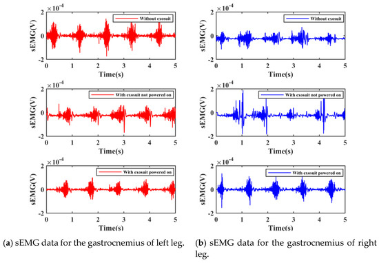Assisting in muscle output and providing additional force to the joint are the basic goals for designing a wearable robot. To measure the compensation effect of the lower extremity exosuit on muscle activation, we measured the physiological data of gastrocnemius muscle using sEMG sensors. The test was also divided into three groups: without the exosuit, with the exosuit powered off and with the exosuit powered on. Other experimental conditions are the same as those in the physiological metabolic test.