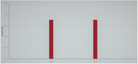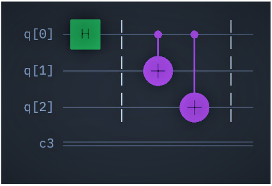 Contemporary quantum computers based on the circuit model can readily produce general states involving n entangled qubits, which are denoted by . Implementing such a circuit requires n qubits, one Hadamard gate that is applied to the first qubit, and CNOT gates. We refer the interested reader to [43] for a practical methodology that can be utilized to construct efficient GHZ circuits, in the sense that it just takes steps to produce the state. For the proposed protocol, triplets suffice. A typical circuit capable of generating the state is given in Figure 1. The circuit was designed using the IBM Quantum Composer [44]. The dotted lines are not part of the circuit; they just serve to provide a visual aid in order to distinguish “time slices”. Figure 2, also taken from the IBM Quantum Composer, depicts the state vector description of the state.