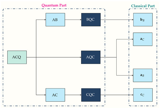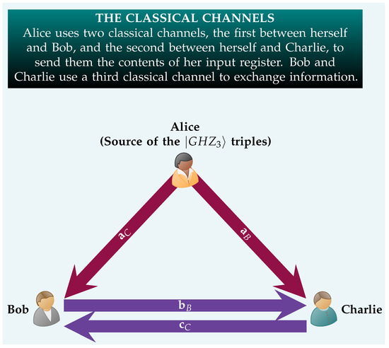 Figure 8 depicts graphically the classical communications between the players that must take place through the public classical channel in order to successfully complete the protocol. After these communications have taken place, the ESR protocol is concluded. Bob knows , , and, of course, the contents of his input register, and can discover the secret information , according to Equation (28). Symmetrically, Charlie, being in possession of , , can reconstruct , as Equation (27) asserts. Alice, despite her critical contribution to the implementation of the protocol, lacks the necessary information, namely and , which has not been made public. Thus, she is in no position to uncover either , or .