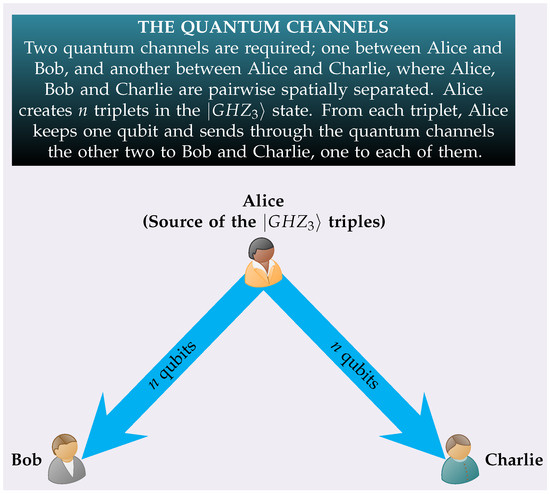 - Alice must use two classical public channels to communicate with Bob and Charlie. Specifically, she must send through these channels the information bit vectors and to Bob and Charlie, respectively.