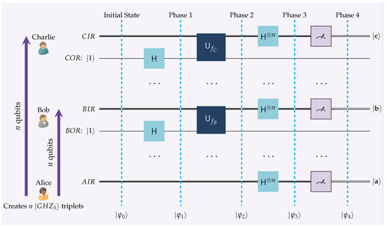 As the third phase unfolds, Alice, Bob and Charlie apply their n-fold Hadamard transform to their input registers, driving the quantum circuit to the next state .
