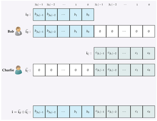 The next Figure 6 is intended to clarify pictorially the formation of the aggregated information bit vector from Bob and Charlie’s information bit vectors and , via the use of the auxiliary information bit vectors and .