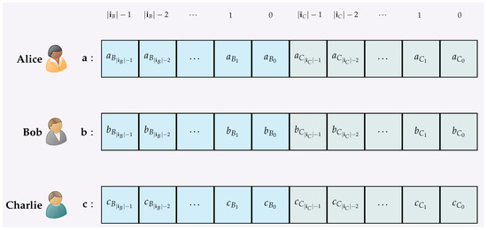 The following Figure 7 visualizes the situation regarding the contents of Alice, Bob, and Charlie’s input registers.