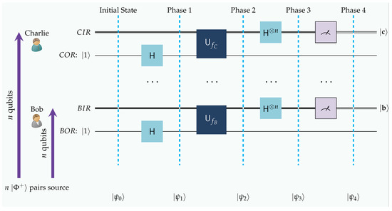 It is during the second phase that Bob and Charlie simultaneously encode the information they intend to exchange within the state of the quantum circuit. They do so by acting with their unitary transforms and on both their output and input registers. The unitary transforms and are constructed using the functions and , respectively, according to the usual scheme