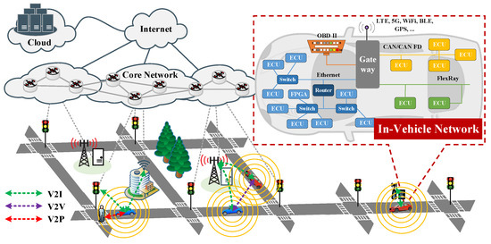 Meanwhile, with the increasing number of embedded electronic control units (ECUs) and external communication interfaces, the in-vehicle network (IVN) has been developed from a simple point-to-point control bus to a distributed and heterogeneous communication and control network to guarantee controls and communications among the onboard modules [3]. A diagram of an ICV with a heterogeneous in-vehicle network in the IoV is provided in Figure 1.
