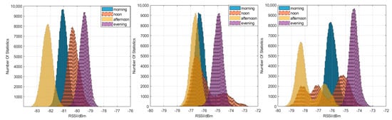 It is worth mentioning that the distribution of FM signals is different in different periods, as shown in Figure 3. However, after three consecutive days of testing, the FM signal in the same period found that, although the distribution model parameters of the signal were not the same, the overall distribution state of the signal did not produce large differences and there was almost no change in the number of peaks, as shown in Figure 4.