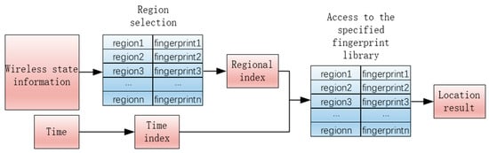 In addition, when the overall positioning area covers a large physical space, each fingerprint matching requires comparing the fingerprint data of the entire positioning space [13], which wastes a great deal of resources. Therefore, before positioning, a pre-trained classifier was used to initially screen out the region where the target is located, obtain a region index, and search the target fingerprint set jointly with the temporal index, thus reducing the matching time of fingerprint localization. The multi-level fingerprint localization process is shown in Figure 6.