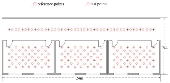 The positioning space selected in this paper is the laboratory place for daily learning. It includes three laboratory rooms and a corridor, with a total area of 7 × 24 = 168 . There were 107 reference points in the whole positioning space, the distance between adjacent reference points in each separate area was 1 m, and there were 183 test points. The relative positional relationship of the localization space to the test point of the reference point is shown in Figure 7.