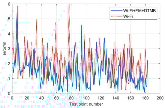 The multi-source data self-decision fusion localization algorithm was compared with the Wi-Fi localization alone, as shown in Figure 8, while either FM or DTMB was introduced for single-source-assisted localization. The localization method presented in this paper has an average error of 1.41 m, which improves the final localization accuracy by 30% compared to the Wi-Fi localization. Figure 9 is a plot of the error accumulation distribution for the different localization methods. As shown in Figure 9, if one of the FM signals or DTMB signals were used to assist Wi-Fi for positioning, the final positioning error is slightly higher than the result obtained by Wi-Fi alone. The accuracy of Wi-Fi with FM signal and DTMB signal was greatly improved.
