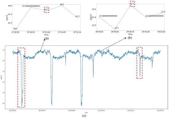 An example of the disadvantages of using an attention mechanism to capture data information. (a) Traffic speed of PeMSD7 (M) dataset road id 49 at 1:00 on 7 May 2012. (b) Traffic speed of PeMSD7 (M) dataset road id 49 at 0:55 on 9 May 2012. (c) the traffic speed of road id 49 on PeMSD7(M) dataset from 6 May 2012 to 11 May 2012.