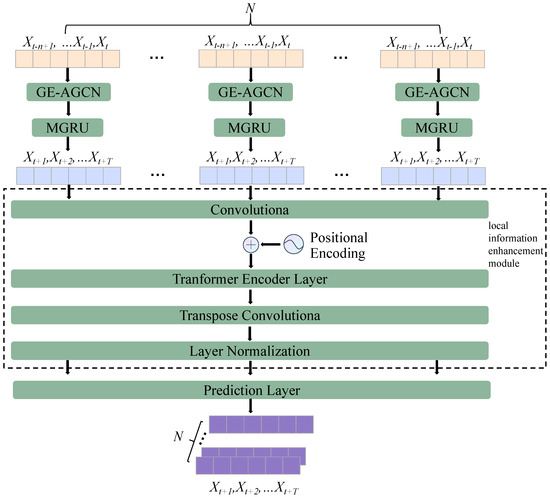 The EIGRN is composed of three parts: a GE-AGCN, an MGRU, and a local information enhancement module. The GE-AGCN learns the relevant information of the topology graph through graph embedding, generates an adaptive matrix instead of the original topology graph to capture the spatial information of each node, and learns the specific parameters for each node. Compared to a GRU, the MGRU ’s hidden layer unit, ht, passes through the spatial model GE-AGCN, thereby strengthening the learning of spatial information while capturing the time correlation. The local information enhancement module is used to simultaneously learn the global and local correlations of the data. It consists of a CNN, a transposed convolutional neural network, and a Transformer encoder layer. The Transformer encoder layer is made up of an attention mechanism and a feed-forward neural network. The attention mechanism is used to capture the global correlation of the data, whereas the CNN is used to capture the local context information of the data. They combine to make up for the limitations of the local imperceptibility of the attention mechanism. To capture different local information, multiple local information enhancement units are arranged in series in this model. As shown in Figure 2, the historical traffic data of length n are inputted into the model. The data are entered into the GE-AGCN, which learns the hidden spatial information of the data and then inputs this information into the MGRU. The MGRU strengthens the capturing of the spatial correlation while learning the temporal correlation. Finally, the obtained temporal sequences with spatio-temporal correlations are input into the local information enhancement module to capture the global and local correlations of the data. At the same time, in order to avoid the vanishing gradients problem, residual connections [25] are used to connect the outputs.