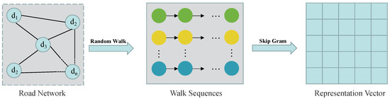 The Node2vec algorithm is shown in Figure 3. Node2vec is one of the algorithms used for graph embedding. Based on the idea of text representation, it uses the random-walk strategy to sample vertices and generates the neighbor sequence of vertices. The Skip-gram model is then used to learn the vertex representation [27]. Unlike the uniform random-walk strategy utilized in DeepWalk [28], the Node2vec random-walk strategy incorporates bias. In addition, it introduces jump hyperparameters p and q to control the random-walk strategy. Assuming the current random walk has traversed edge (t,v) to vertex v, the transition probability from vertex v to vertex x is denoted as , where represents the weight of edges.