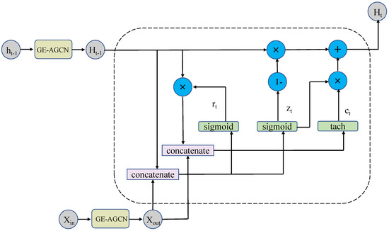 The GRU uses the hidden state of time and the current traffic information as input to obtain the traffic information at time t. As shown in Figure 4, is the reset gate, which controls the extent to which the state information from the previous moment is disregarded; is the update gate, which controls the incorporation of the state information from the previous moment into the current state; is the memory content stored at time t time; and is the hidden state at time . In order to capture temporal information and incorporate spatial relationships, we applied an improved GCN operation on the hidden layer unit of the GRU. Specifically, in the original GRU, is fed directly into the GRU; however, in our approach, first enters the GE-AGCN before being fed into the GRU. Compared to a traditional GRU, our approach allows to capture the spatial correlation of traffic data, which enables the model to capture both the spatial and temporal information of the data. This means that the MGRU can transform the hidden state of a traditional GRU at moment t into a new hidden state , which contains the current spatial information through the use of the GE-AGCN, as shown in Formula (8):