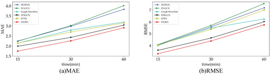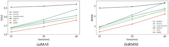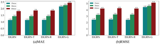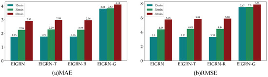 Three ablation experiments were designed to verify the effectiveness of our module. In EIGRN-G, the spatial model in the EIGRN was replaced with an ordinary GCN. In EIGRN-R, the improved GRU in the EIGRN was removed. In EIGRN-T, the local information enhancement module in the EIGRN was removed. The results of the ablation experiments are shown in Table 4 and the visualization results are shown in Figure 10 and Figure 11. Regarding the forecasting performance of the EIGRN-G model, we can see that when our spatial model was replaced with the original GCN, the RMSE and MAE errors increased across all periods. This indicates that our graph embedding-based generative graph model had better spatial forecasting ability, thereby proving the effectiveness of our spatial model. In addition, the forecasting results of the EIGRN-R and EIGRN-T exhibited similar patterns. This demonstrates that the time-capturing ability of the MGRU improved after capturing spatial information. In addition, the local information enhancement module captured the importance of global and local relationships.
