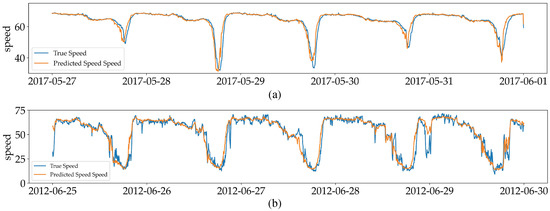 (a) Visualization results of the predicted and real values of the PEMS-BAY dataset. (b) Visualization results of the predicted and real values of the PeMSD7(M) dataset.