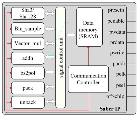 The National Institute of Standards and Technology (NIST) announced a call for Post-Quantum Cryptosystem (PQC) standards in February 2016, with plans to formally complete the standardization of PQC by 2024. The first round of the competition screened 69 candidate algorithms, and 26 candidate algorithms were retained in the second round. After three rounds of screening, seven PQC solutions, including Saber, Kyber, and Falcon, entered the final evaluation. Among them, the Saber [4] algorithm is a lattice-based key encapsulation mechanism (KEM) that works against chosen ciphertext attack (CCA), and its security depends on the difficulty of the module learning with rounding (MLWR) problem. Lattice-based cryptographic problems, such as the shortest vector problem (SVP) and closest vector problem (CVP), are not susceptible to quantum computing. Among various quantum-resistant cryptographic schemes, lattice-based approaches are particularly promising due to their robust security against quantum attacks, higher computational efficiency, and flexible applications. This is why the lattice-based grid code scheme occupied five out of the seven candidates selected by NIST for the third round of standardization. The Saber algorithm differs from other lattice-based schemes in that it is modulo 2 to the power of 2, which eliminates the need for additional overhead in modulo operations and the rejection of sampling operations. Consequently, the research focus in cryptography revolves around the theoretical study and efficient hardware implementation of Saber’s algorithm. The Saber algorithm mainly involves three steps: key generation, encryption, and decryption, and the security core lies in the random number expansion and large matrix product module, which has the characteristics of fast computing speed and functional diversity, compared with other algorithms [5,6,7]. To reduce the operation overhead of the Saber algorithm, Knuth et al. [8], a team of algorithm proposers, constructed a fast polynomial computation method for the multiplier module in conjunction with the Toom–Cook general algorithm, which effectively improved the operational efficiency of the large matrix product module of the Saber algorithm. To further optimize the Saber algorithm, Sujoy et al. [9] used vector processing instructions to process the algorithm operations in parallel, resulting in a nearly 1.5-fold increase in throughput, while increasing the latency of individual operations by a factor of about 3. In terms of hardware–software co-design, Mera et al. [10] and Dang et al. [11] used a hardware–software co-design strategy to allocate hardware–software resources for cryptographic algorithms through software algorithms, which can achieve high-speed and flexible cryptographic algorithms. Although hardware–software co-design has obvious advantages in terms of flexibility in algorithm implementation, there are still shortcomings in terms of latency and throughput, so hardware implementation of algorithms has become a research trend. Roy et al. [12] implemented a high-speed dot matrix Saber algorithm on FPGA, with a running time of 61.4 μs at a clock frequency of 250 MHz. To meet the requirements of the Saber algorithm in resource-constrained situations, and to reduce the running time and power consumption of the algorithm hardware [13,14,15,16,17], there is an urgent need to study lightweight cryptographic algorithms. Based on this, this design constructs the algorithm model based on the official documentation [18] of the algorithm, and thus completes the full hardware implementation of Saber’s algorithm.